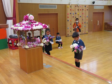 帰りにお花御堂を玄関に出して、お迎えに見えた保護者の方にも見て頂きました。