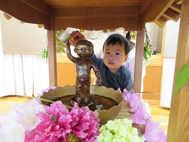 お花御堂の中にいる誕生仏は天と地を指さしています。小さなお友だちも、そっと甘茶をかけてあげています。
