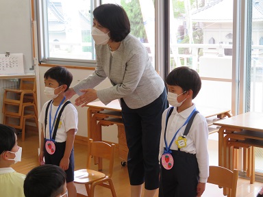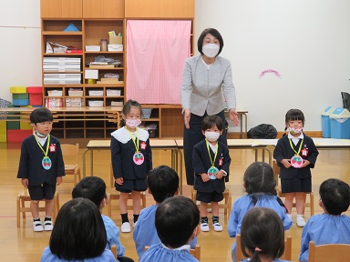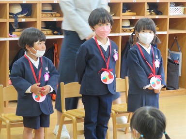 誕生者に園長先生からペンダントをかけて頂き、お家の方からは名前の由来をお聞きしました。