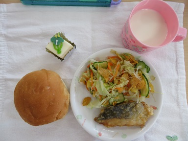 誕生会の日の給食は、丸コッペパン・サワラ味噌バターソース・コーンフレークサラダ・プチケーキ(0.1歳児はオレンジ)でした。