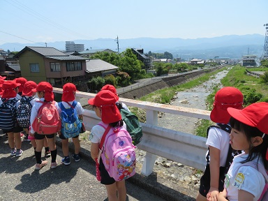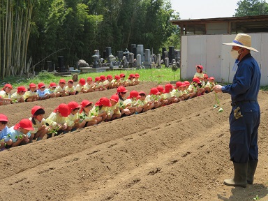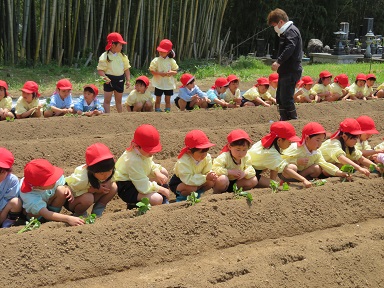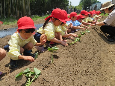 19日、いいお天気に恵まれて年長さんは飯田女子高校にある畑にさつま芋の苗植えに行ってきました。