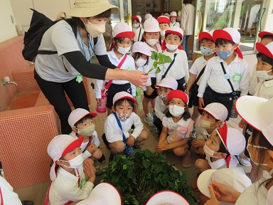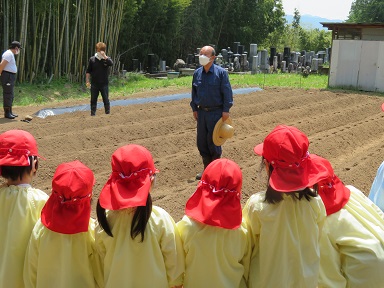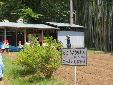 年長さんはお芋の生長を見たり草取りをしに何度か芋畑に行く予定です。その間にも斎藤さんには畑のお世話をして頂きますので、「お願いします」の挨拶をしてきました。