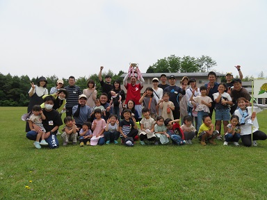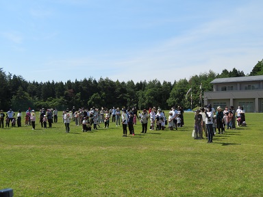 参加された全家庭が整列し、開会式が始まります。飯田女子短大のグランドは芝。芝の緑と空の青がとてもきれいです。