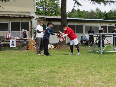 決勝戦は1点差のとてもいい試合でした。優勝はきく組。川手会長から優勝カップを頂きます。