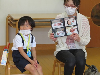 年中さんでは、産まれた時の写真を見せて頂いています。「かわいいな」「小さかったんだね」。写真からも幸せな雰囲気が伝わってきました。