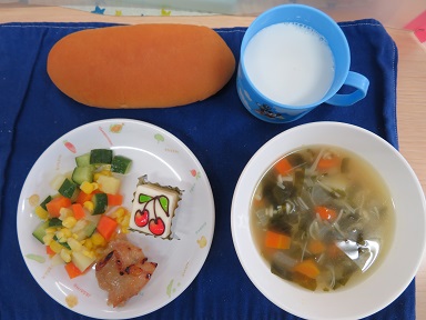 誕生会の日の給食です。色どりのきれいな献立でした。お楽しみのデザートのケーキは、「さくらんぼ」があしらってありました。(0.1歳児はオレンジ)