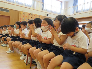 集会への参加が初めての年少さんもきちんと手を合わせて皆でお参りをしています。