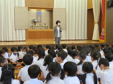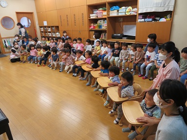 3歳以上児は遊戯室に集まって集会を行いました。