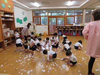 年少さんは紙の雨を降らせています。この雨(紙)は、はさみが扱えるようになってきた年少さんが、チョキチョキと沢山切ったものです。
