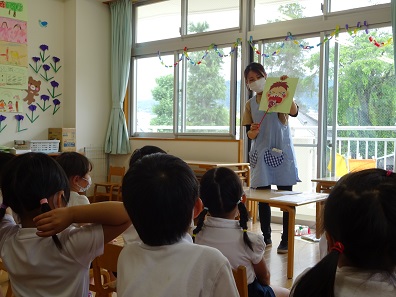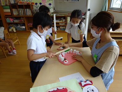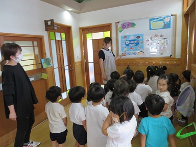 養護教諭が年長さんの保育室に行って歯科指導をしました。