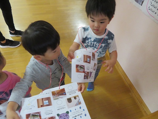 2歳児のお友だちは園内探検をしています。「ほら、シールを貼ったんだよ!」と探検カードを見せてくれました。