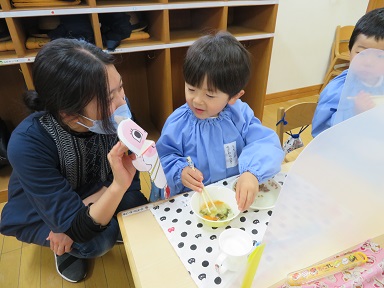 期間中は「カミカミ献立」で、よく噛む必要のある食材や歯を強くする食べ物が出されました。飯田女子短大のカミカミサークルから頂いた「カミンちゃん」を見ながらよく噛んで給食を頂きます。