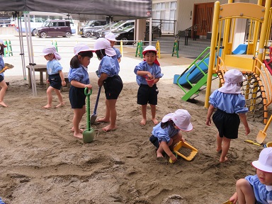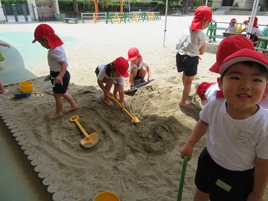 今年初めて裸足になって砂場に出た年少さんと年中さん。