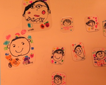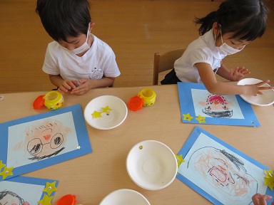 年中さんはお父さんの似顔絵を描きました。その回りに星型の折り紙を貼って装飾しています。