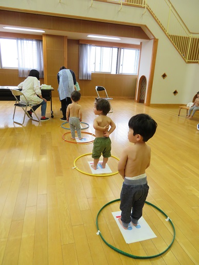 順番が来るまで並んで待ちます。2歳児のお友だちも上手に並んで待つことが出来ました。