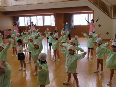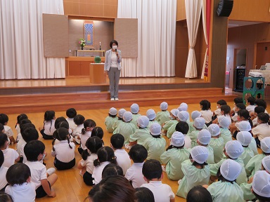 スイカをお供えし、プール開きを行いました。今回もコロナウイルスの感染状況が落ち着いてきて来ているので3歳以上児は遊戯室で集会を行いました。
