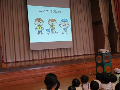 スライドを見ながら、約束事の確認をします。楽しい水遊びですが、安全に出来るように皆で確認をしました。
