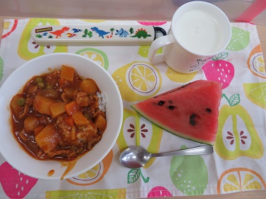 給食は、お供えしてあったスイカとハヤシライス、牛乳。