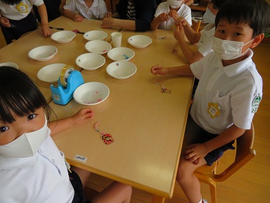 19日の父の日にちなみ、お父さんについて話をしたり歌をうたったりしてきました。母の日と同じように父の日もあることを知った子どもたち、お父さんにもプレゼントを渡したい!と意欲的に作ることができました。