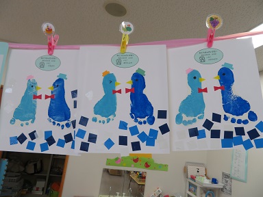 2歳児さんは、足形のペンギン。ペンギンの周りの氷は子どもたちがビニールテープをペタペタと貼りました。