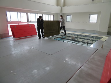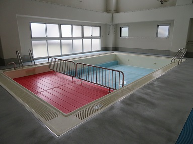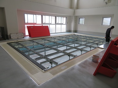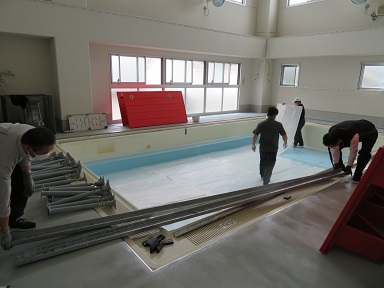 シーズンオフは、床を張ってジュータンを敷いて遊び場になっていたプールですが、17日のプール開きに向けてプールの設営を行いました。