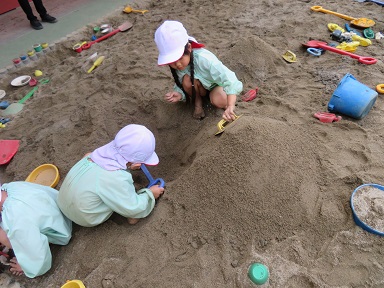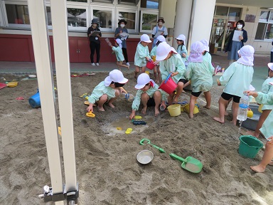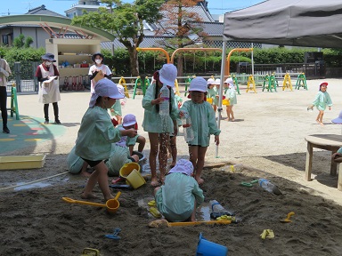 砂場や園庭で、砂や水に関わりながらダイナミックに夏ならではの遊びを楽しむ姿が見られました。