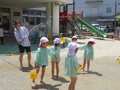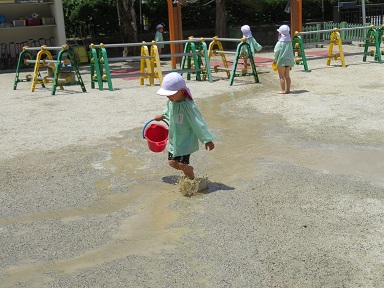 とても暑い日でしたので、冷たい水が気持ちいい! 園庭に水の道が出来ました。バシャバシャと走っています。汚れを気にせず遊ぶ子どもたちでした。