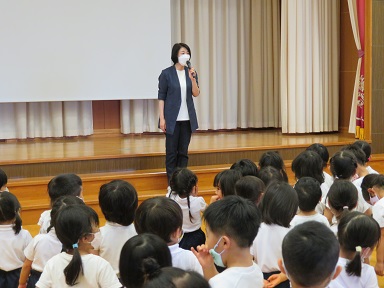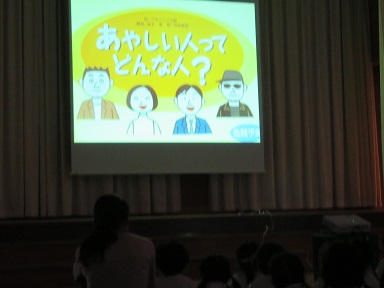 皆無事に避難し、不審者もいなくなってから遊戯室で3歳以上児は集会を行いました。園長先生のお話をお聞きしたり、「あやしい人ってどんな人?」というスライドを見ました。人は見かけだけではあやしいかどうか分かりません。自分の身を守ることを小さいうちから考えていきたいと思います。