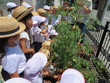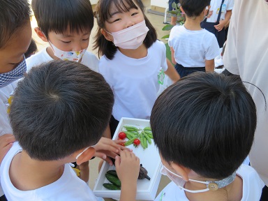年長さんの育てている野菜の収穫が始まりました。この日は、ミニトマト・なす・インゲンが採れました。水やりも当番を決めて順番にしてきましたが、収穫も順番に行っていくようです。
