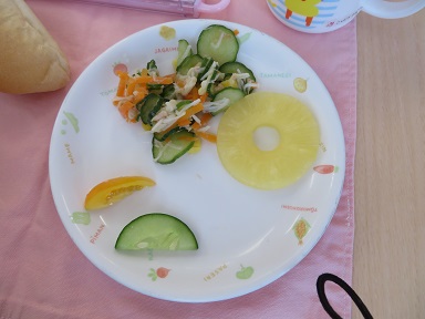 お皿の下の半月のキュウリ、オレンジのミニトマトが自分たちで育てたものです。ほんの一口分ですが味わって大切に頂く子どもたちでした。皆で育てて皆で分けて食べられることが嬉しいですね。