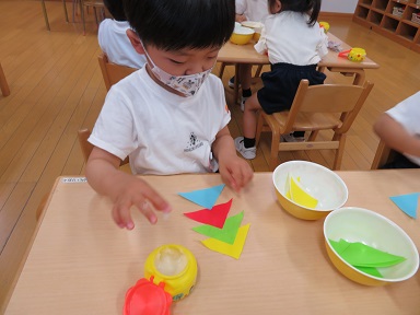 年少さんは三角の折り紙をつなげて三角つなぎを作ったり、スイカに絵の具で色を塗っています。はじき絵になっています。