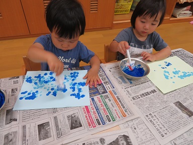 たんぽぽさんはタンポで絵の具をポンポンしています。これは何のお飾りになるのでしょうか? 園の七夕まつりは7日です。