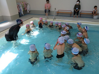 年長・年中組は年に数回、バス添乗員の安藤先生(元スイミングインストラクター)に指導していただきます。