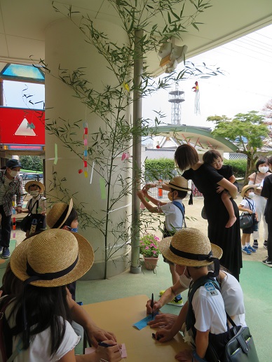 6日の降園時には玄関に笹を飾り、保護者の方にも願い事を書いて笹に飾って頂きました。