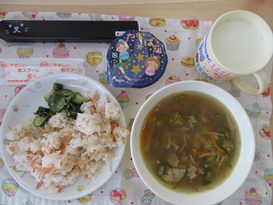 給食は七夕にちなんだ献立です。スープは「流れ星スープ」星形のオクラと細切りのニンジンや大根で天の川を流れる流れ星となっています。