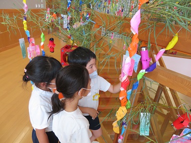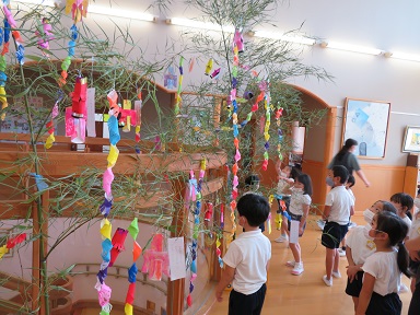 7日、地域のコロナウイルスの感染が増えてきているので集会は行いませんでしたが、各クラス毎1階フリースペースに飾られた野菜や果物を見たり、園内に飾られた笹飾りを見て回りました。