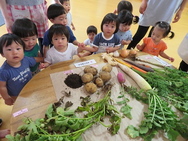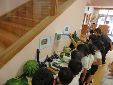 沢山の野菜や果物が並びました。 根を食べるもの 実を食べるもの 茎を食べるもの 葉を食べるものなどに分類してみました。