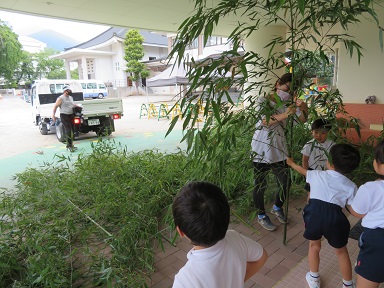 6日の昼に用務員さんが笹を取って来て下さいました。下駄箱にかかった笹のトンネルを通って見に行きます。