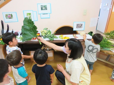 大きな葉っぱは、かぼちゃの葉っぱです。お友だちの顔より大きいな、触るとチクチクするなどと様々な気づきがありました。