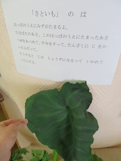 七夕の朝、この葉っぱの上の朝露を集めて墨ですって願い事を書いたという、里芋の葉です。