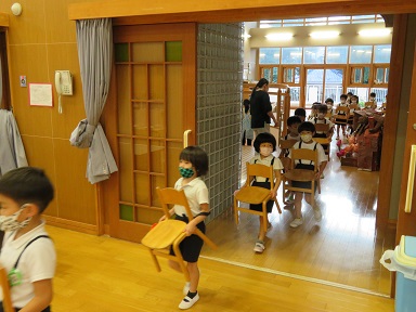 保育室で先生から話を聞きます。少しのドキドキも皆と一緒ならワクワクになりそうです。