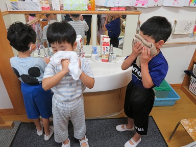 保育室では顔を洗ったり着替えをします。皆いいお顔で起きています。