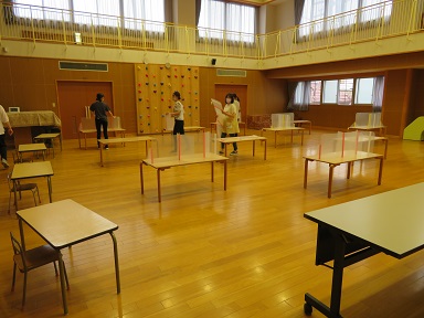 子どもたちが朝の支度をしている間に先生たちは遊戯室で朝食が食べられるように準備をしています。