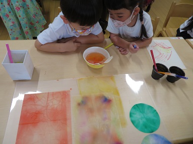 和紙にサインペンで色を付けて水に浸すと、じわっとにじみます。にじんでいく様子を見ている年少さん。