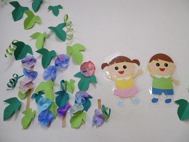 きれいににじんだ和紙は丸く切ってあさがおになりました。涼しげな夏の壁面飾りになっています。