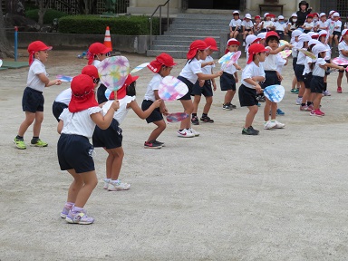 年中さんは自分で和紙染めしたうちわを持って「ほたる」を踊っています。色とりどりのうちわ、とってもきれいですね。