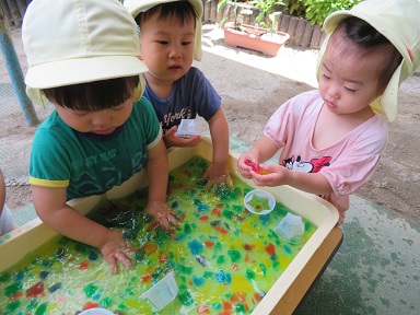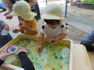 たんぽぽさんは寒天遊びをしています。触ったり、握ったり、すくったり、かき混ぜたり・・・と感触を楽しみながら遊ぶことができました。