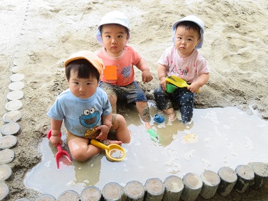 つくしさんは少しずつ水や泥に関わり、気持ちよさや楽しさも味わえるようになってきました。手に持った砂を水に入れると砂が崩れてしまう事も気づき、新たな楽しみ方にも気づいたようです。