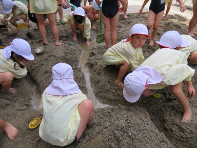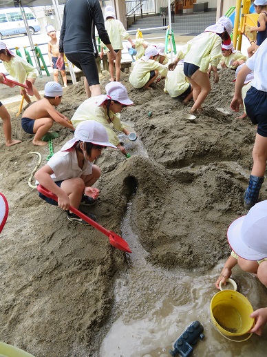 年長さんは砂場に水路やトンネルを掘って水を流しています。砂場を見まわしながら「道をつなげよう」「ここに水を流したらこっちに流れるぞ」と考えながら友だちと遊んでいました。