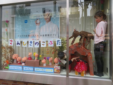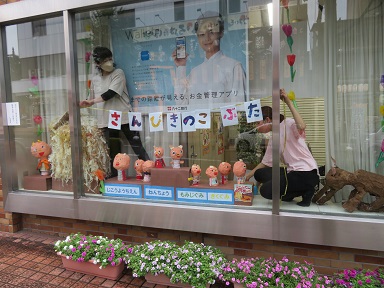 年長組は2クラス一緒に学年合同で人形を作ってきました。「3びきのこぶた」の人形は、八十二銀行飯田駅前支店(中央通り4丁目)のウインドウに飾らせて頂きました。
